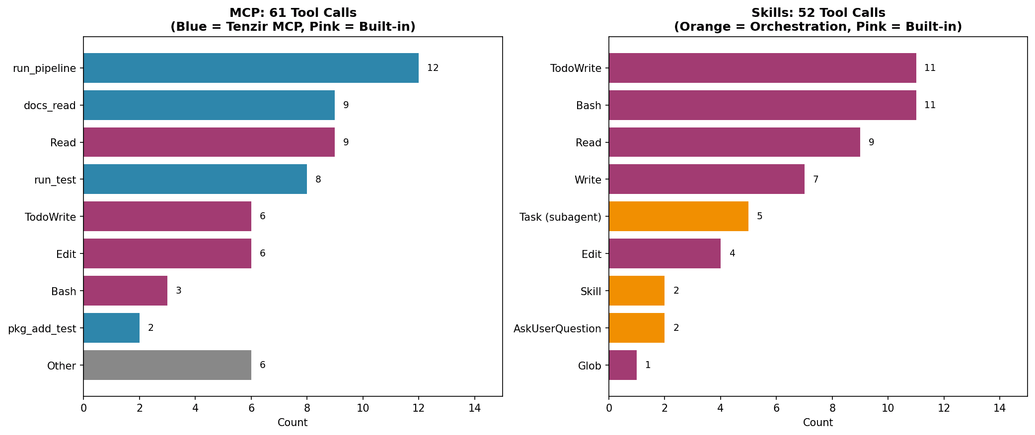 MCP (left) leans heavily on our custom Tenzir tools—the blue bars. run_pipeline, docs_read, run_test. These are purpose-built infrastructure. Skills (right) uses almost entirely generic capabilities—the pink bars. Bash, Write, Read. Plus orchestration tools in orange: Task for delegation, Skill for loading instructions, AskUserQuestion for clarification.